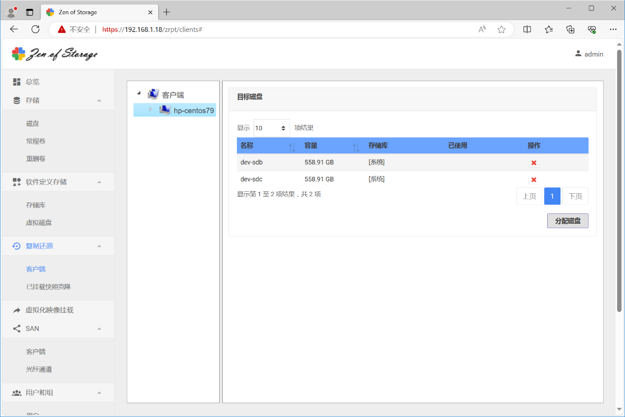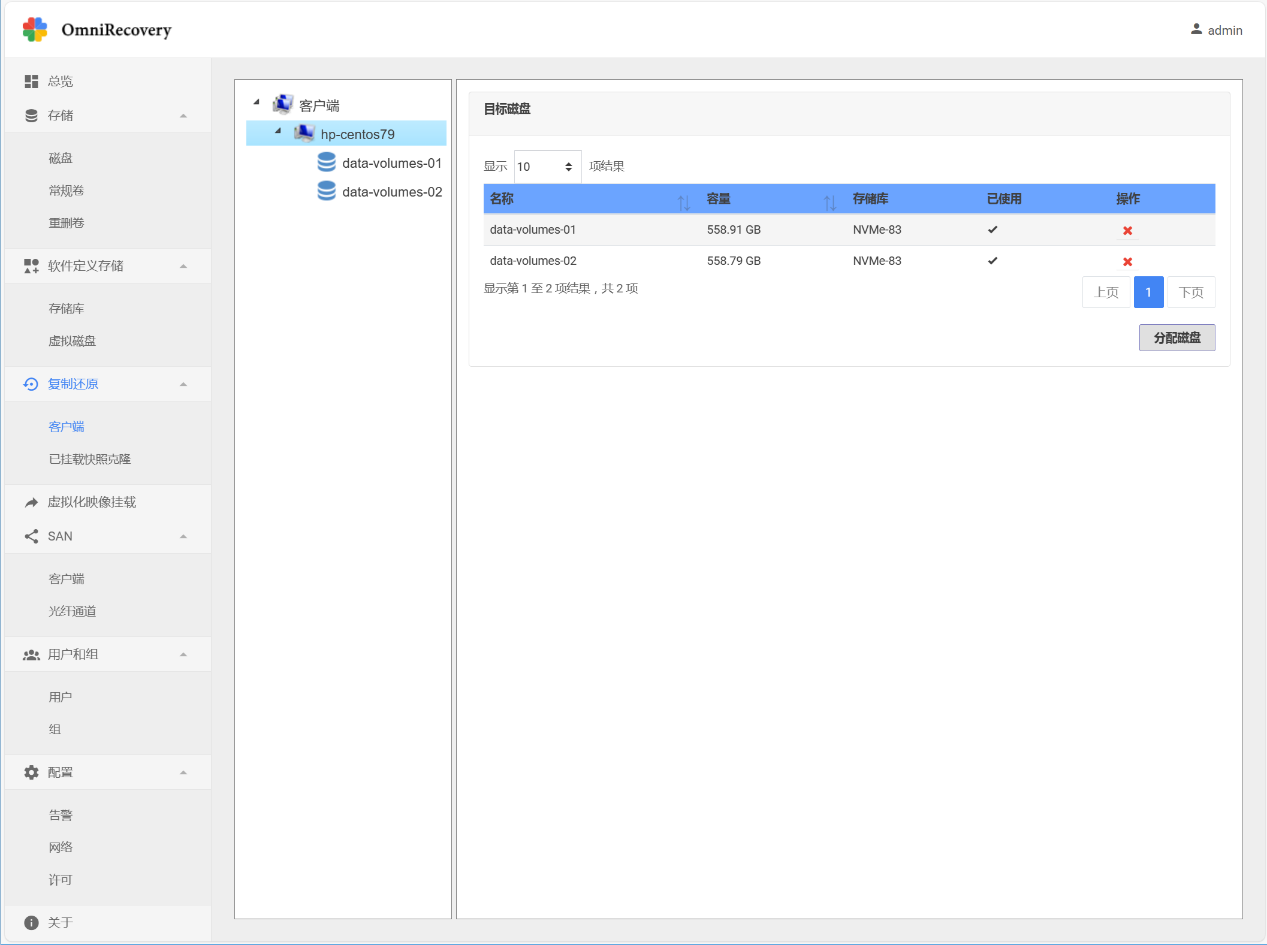 在某些应用场景,需要将客户端的磁盘或卷复制到服务器端的物理盘。通过给客户端分配物理盘,使得客户端在创建保护策略时可以选择物理盘作为目标。