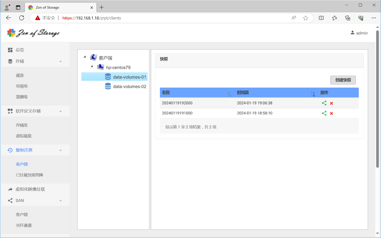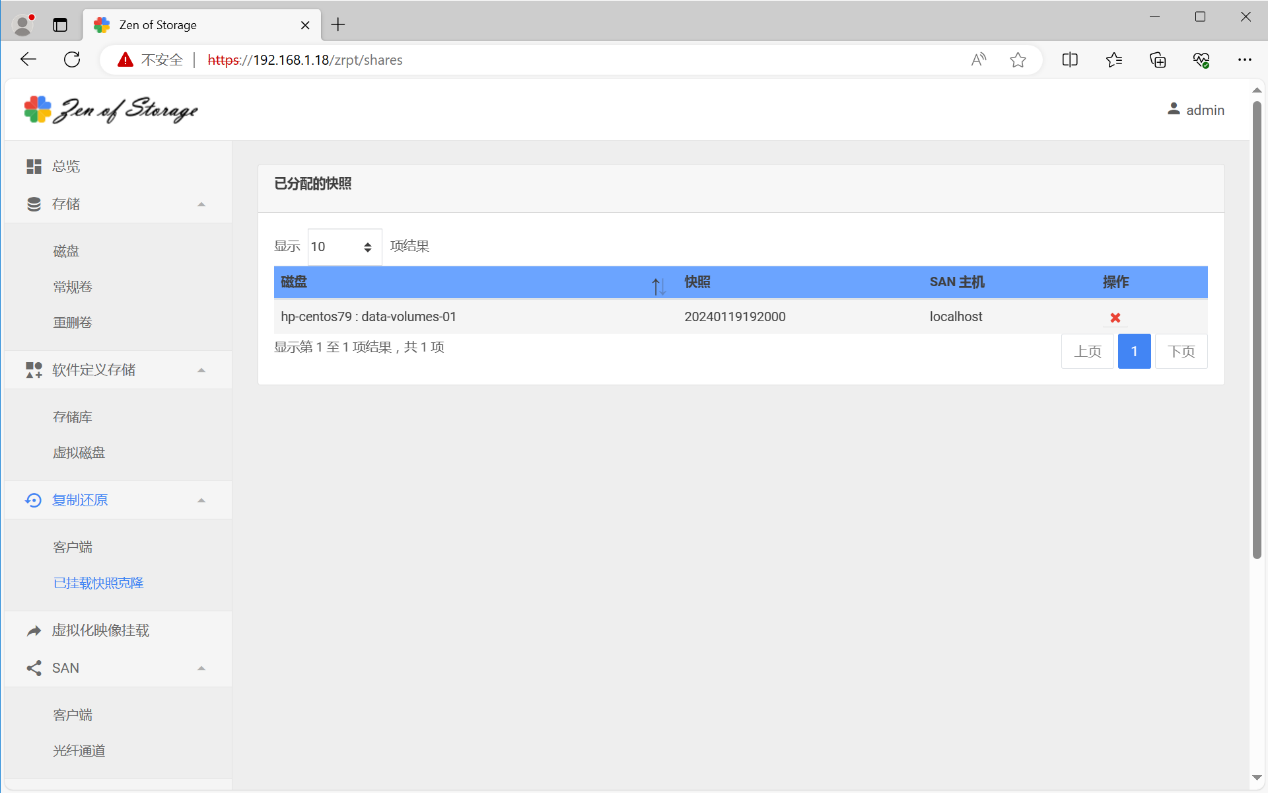 此处显示虚拟磁盘的快照,可以将快照克隆分配给某个SAN客户端。