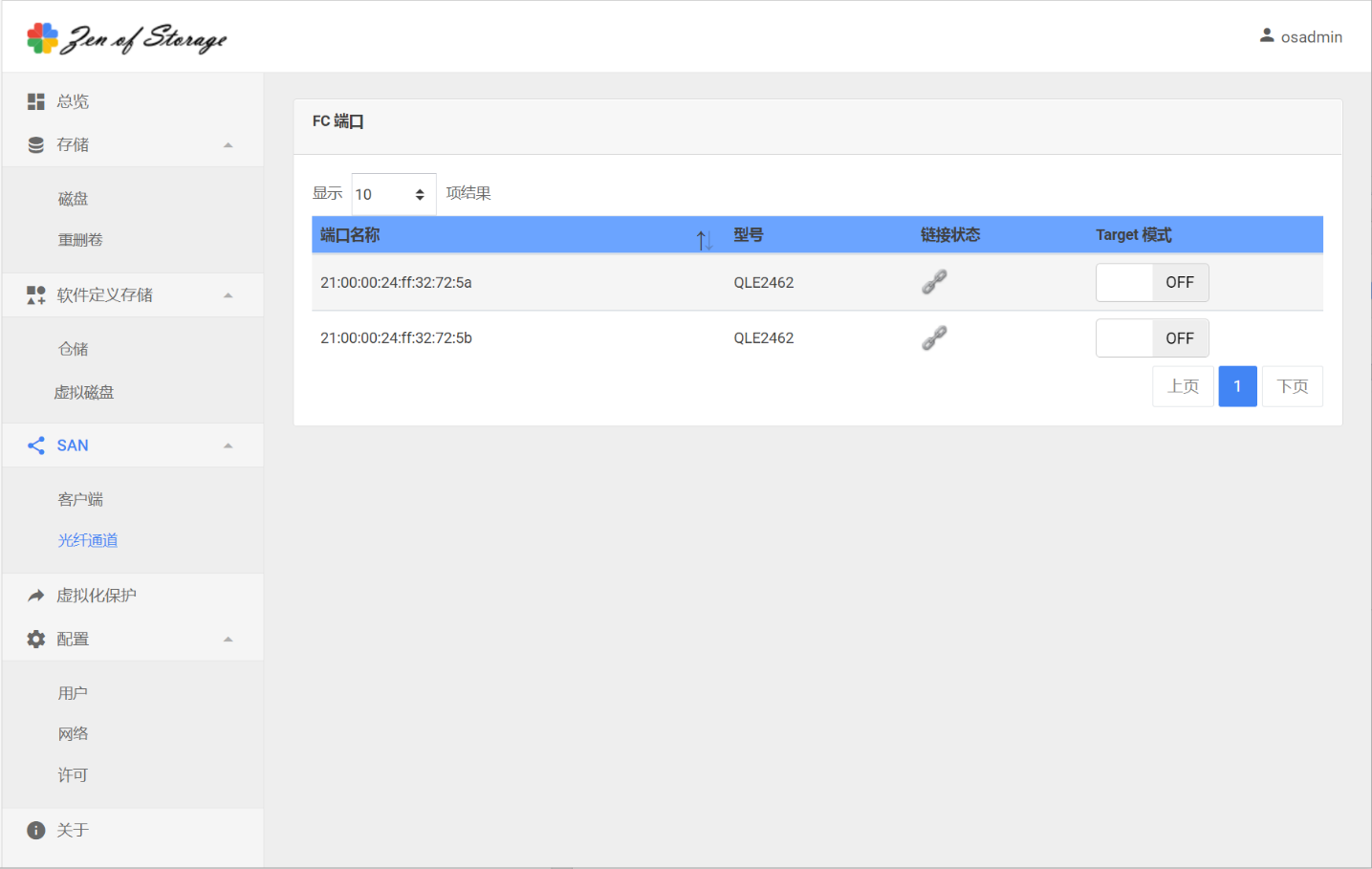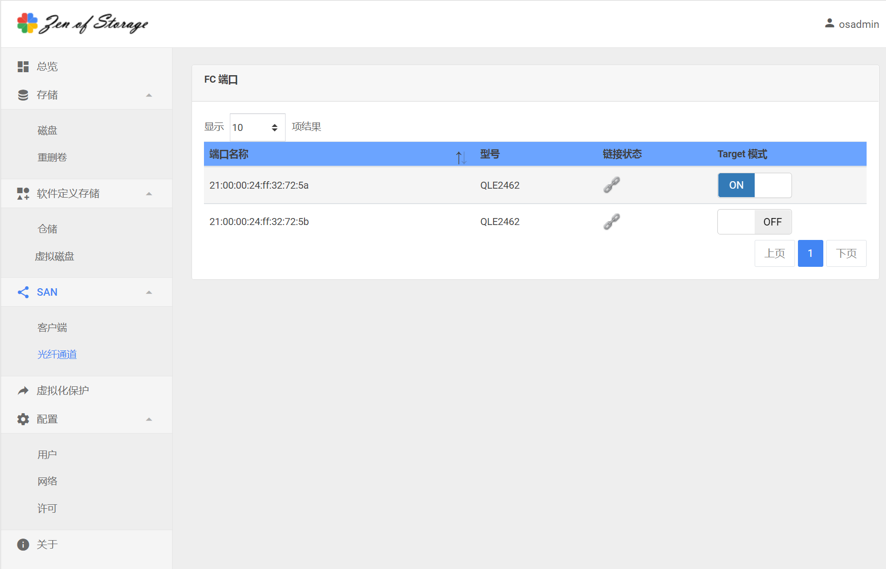 ZenStor支持QLogic 22xx/23xx/24xx/25xx/26xx/27xx系列单口或双口光纤卡作为FC的target。