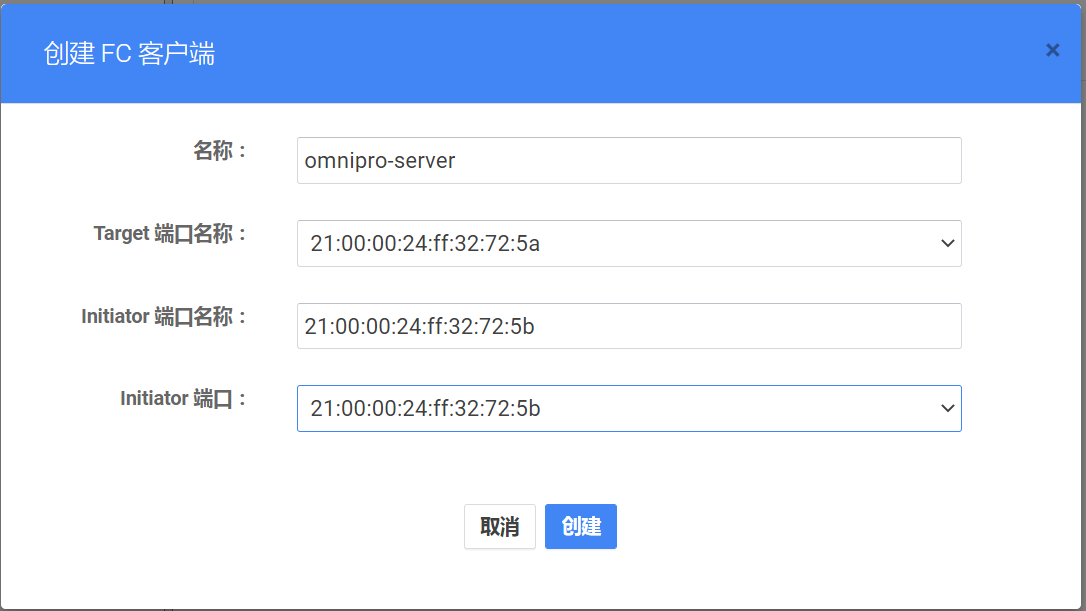 点击“创建FC客户端”按钮进入创建FC客户端对话框。